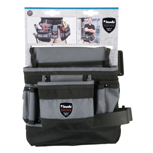 kwb Gereedschapstas, 2-delig, met nylon riem -- Gereedschapstas, 2-delig, zwart/zilverkleurig, dubbele naden afgezet met zilverdraad, met nylon riem (lLengte 75-135 x 5 cm), robuuste kwaliteit, 2 x 1 grote spijkertas, 2 x 1 groot vak met 2 grote en 2 kleine elastieken insteeklussen, 2 x 3 smalle vakken, 2 x 3 vakken voor schroevendraaiers, 2 hamerlussen, metalen clip voor rolbandmaat, incl. kwb WORK WEAR-label.